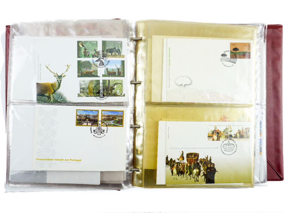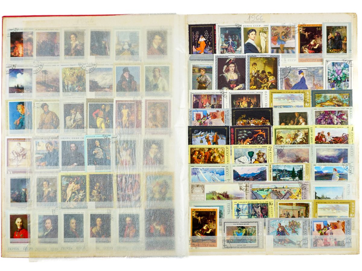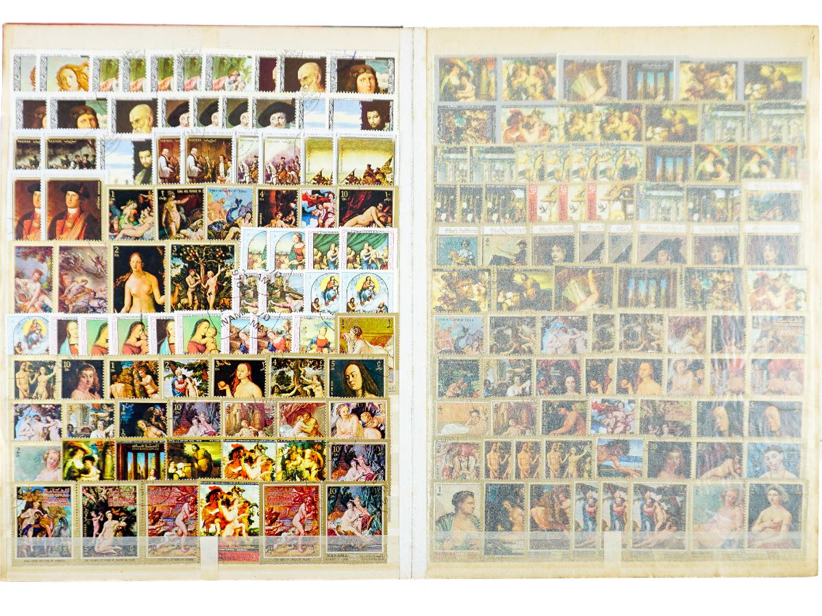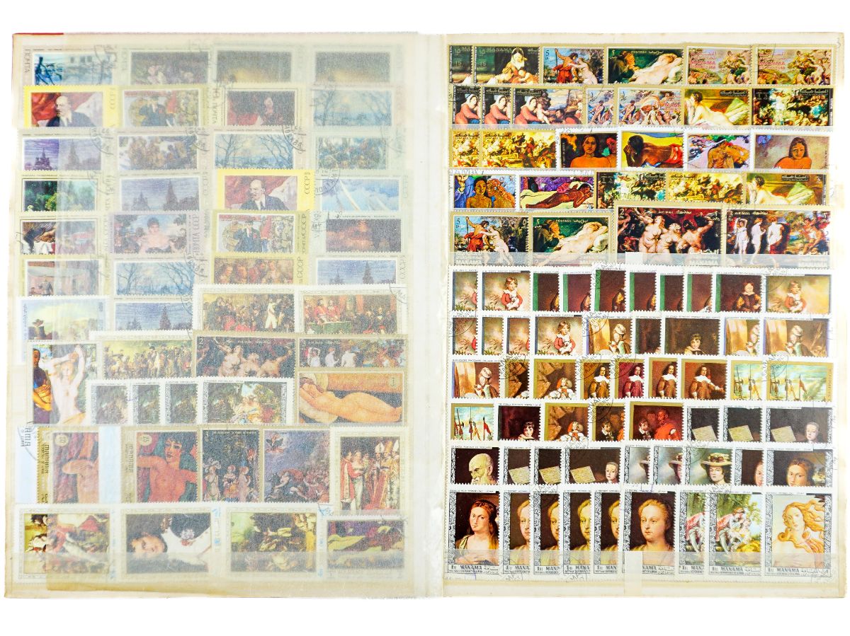 Um classificador com 870 selos a maioria selo grande sobre arte famosa de