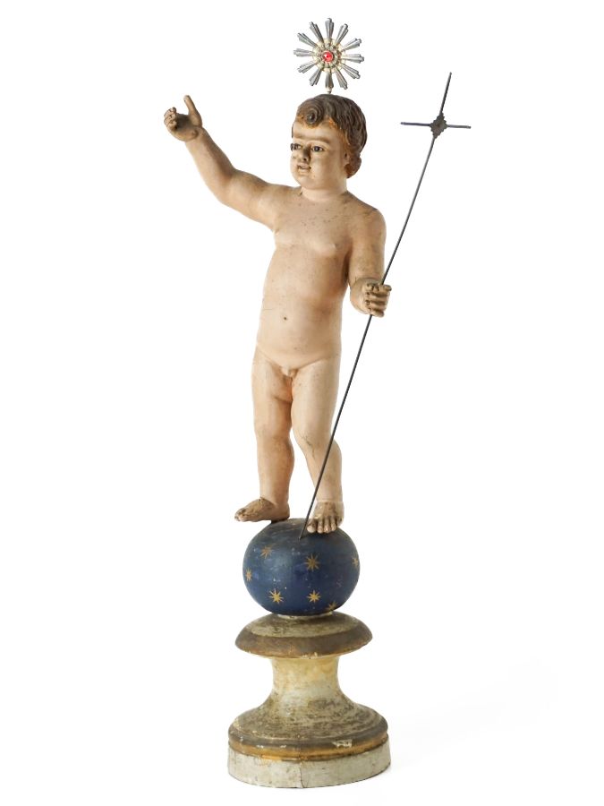 Escultura em madeira com olhos de vidro sobre base em madeira