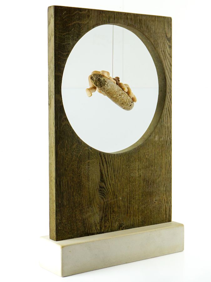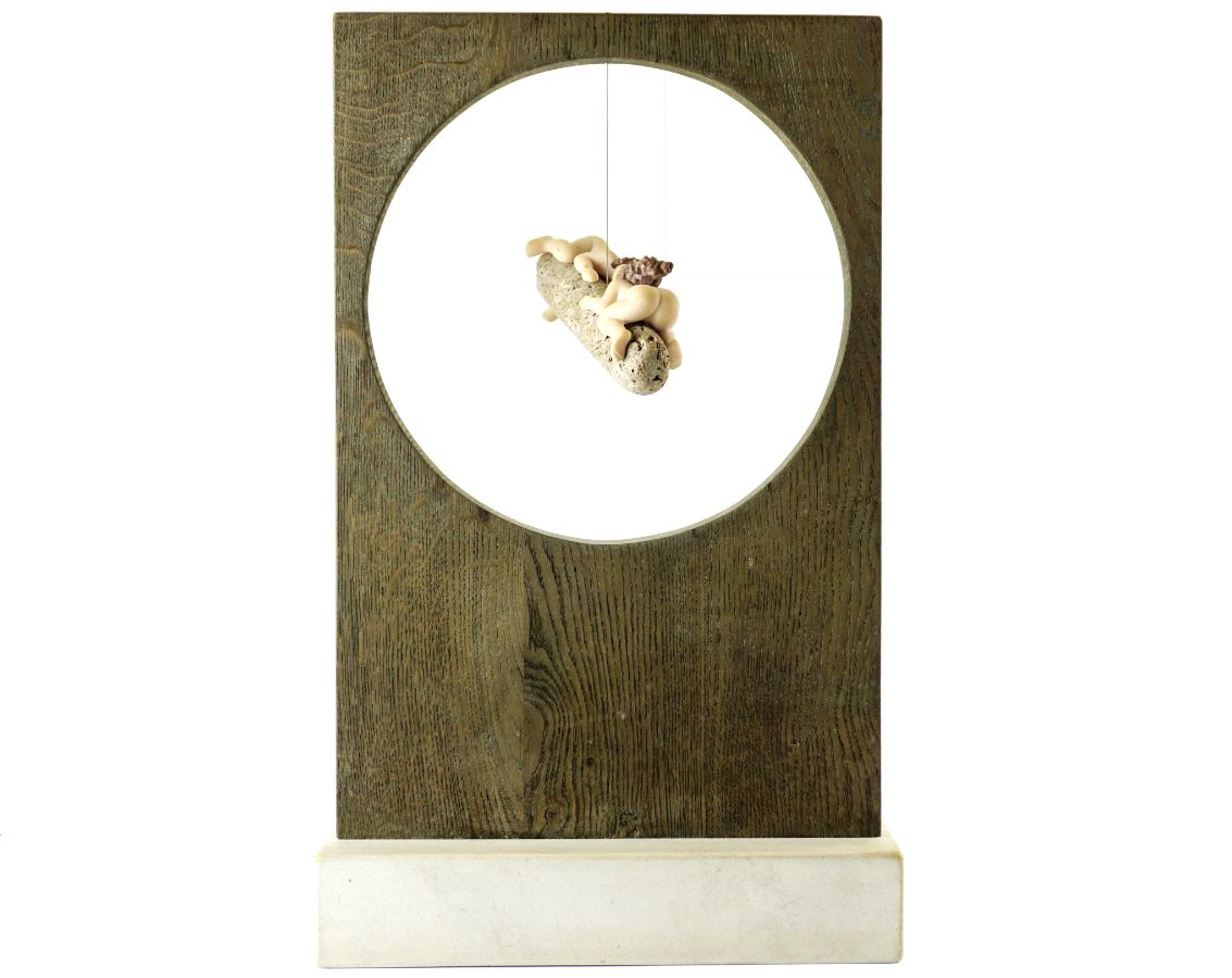 Duas figuras em pedras diversas penduradas numa peça de madeira sobre base em pedra