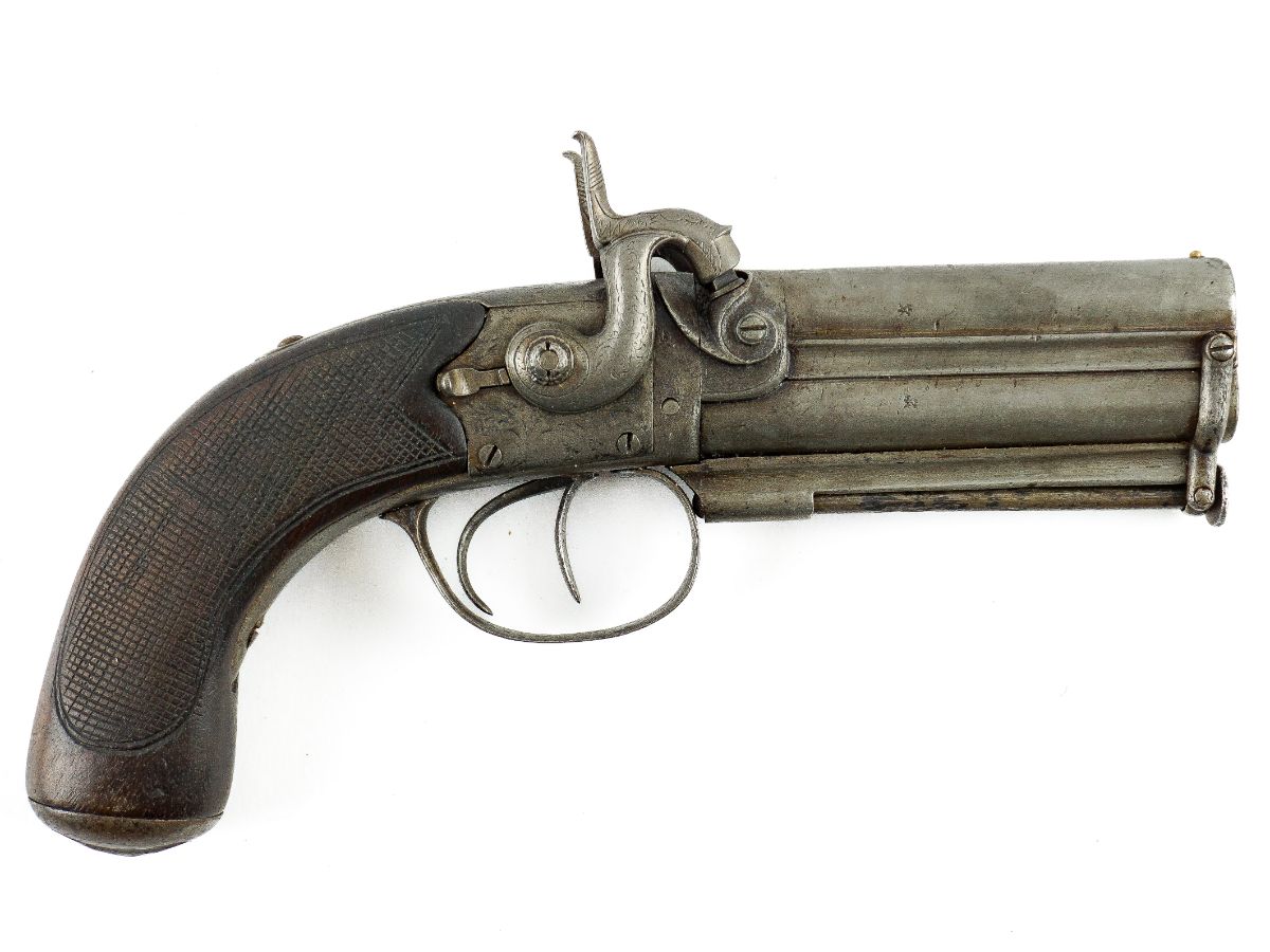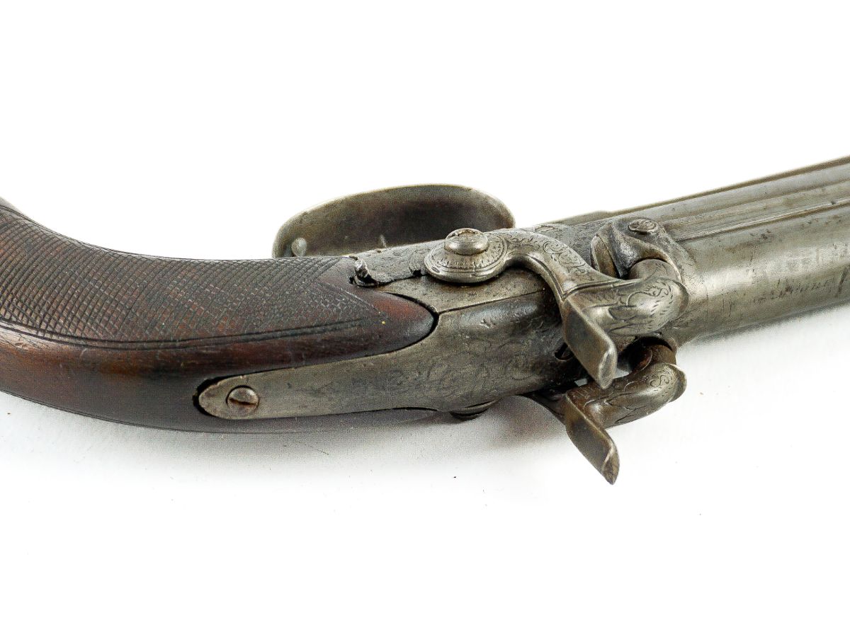 Pistola inglesa de viagem, de meados do século XIX, com dois canos sobrepostos de carregamento pela