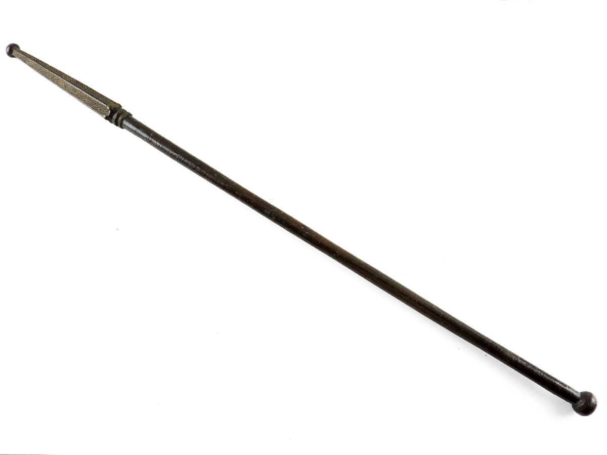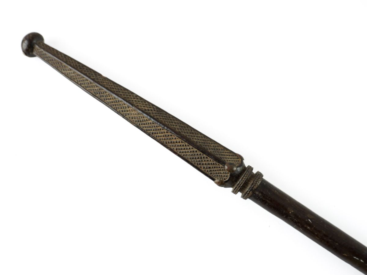 Bastão em madeira com decorações geométricas e pregos. Antigo