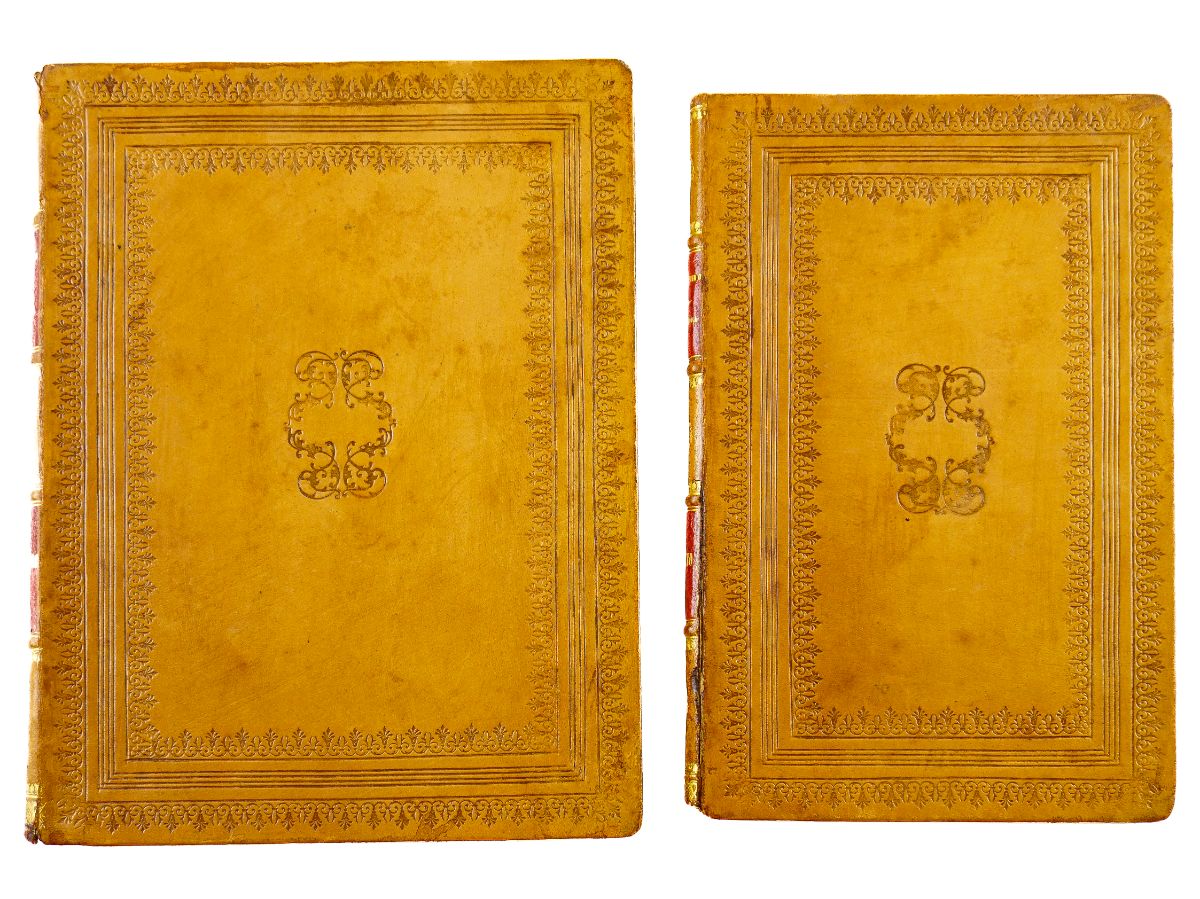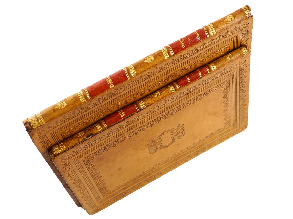 Encadernações inteiras de pele com motovos decorativos a seco.