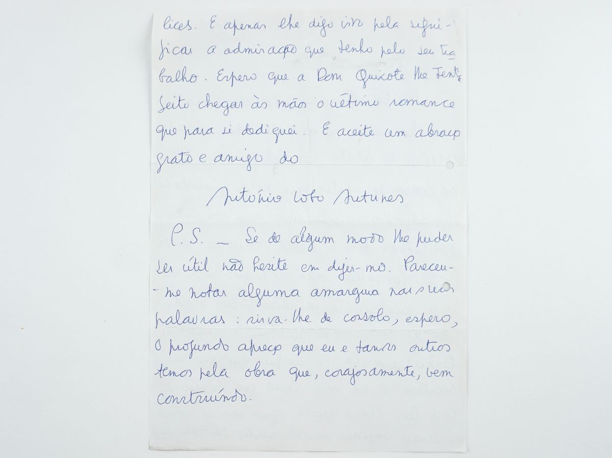 Manuscrito da autoria de António Lobo Antunes ( 16 de Fevereiro de 2004), dirigido a Herminio Monteiro (?) tecendo enormes elogios à editora Assírio & Alvim.
