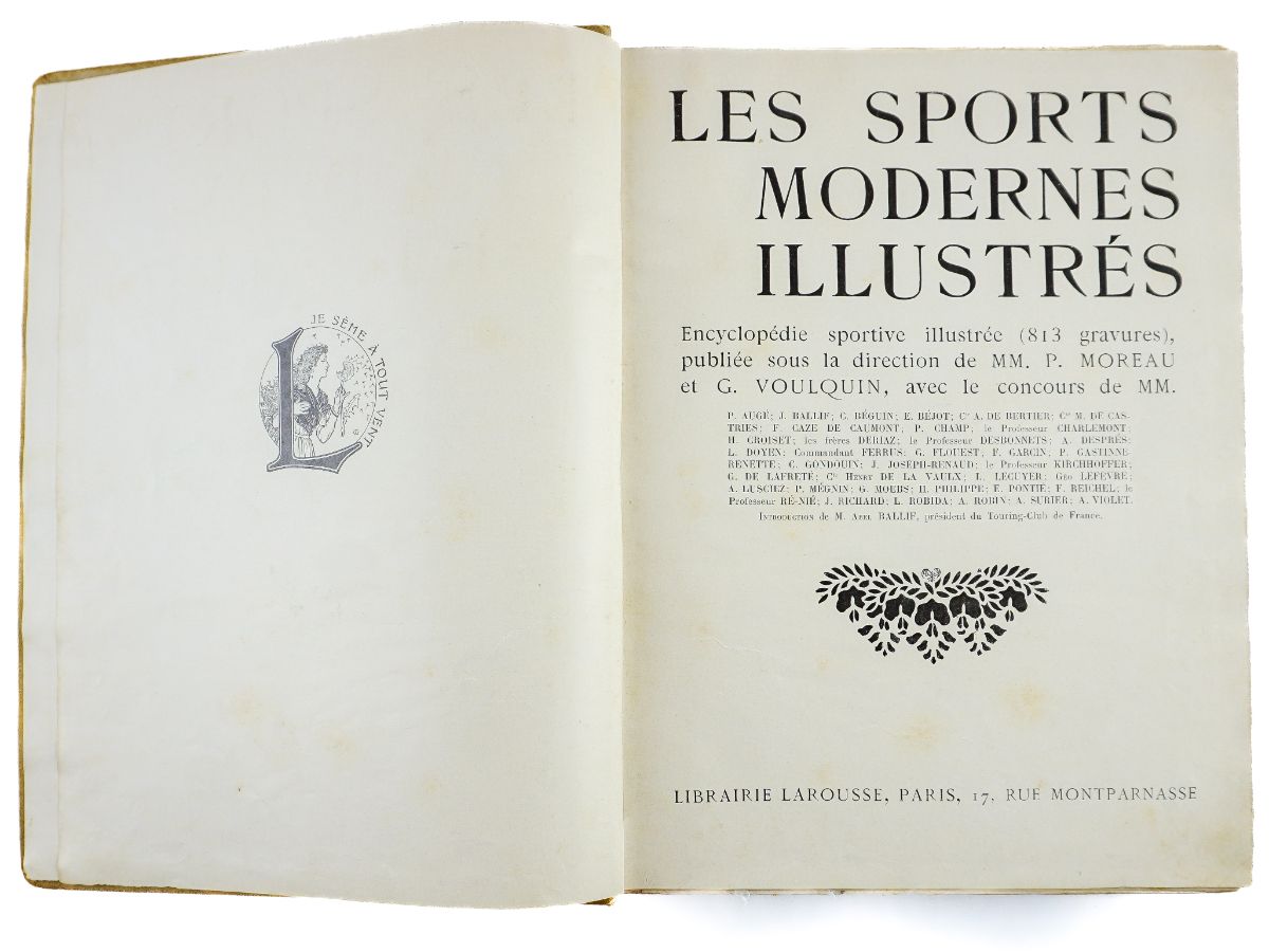 «Éncyclopedie sportive illustrée (813 gravures), publiée sous la direction de MM. P. Moreau et G. Voulquin». 32 cm, 340-[16] págs, ilustrado. LAROUSSE, PARIS – 1905, encadernação editorial.