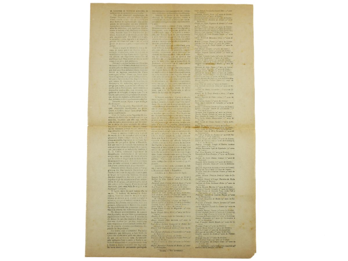 “Ao PAIZ Dos estudantes revolucionários DE COIMBRA” raro manifesto republicano contra a monarquia, autores Oliveira, Joaquim José de; Curto, Amílcar da Silva Ramada; Rosa, Fernando Baeta Bissaia Barreto; e outros, Coimbra 1906 (50 x 35 cm).