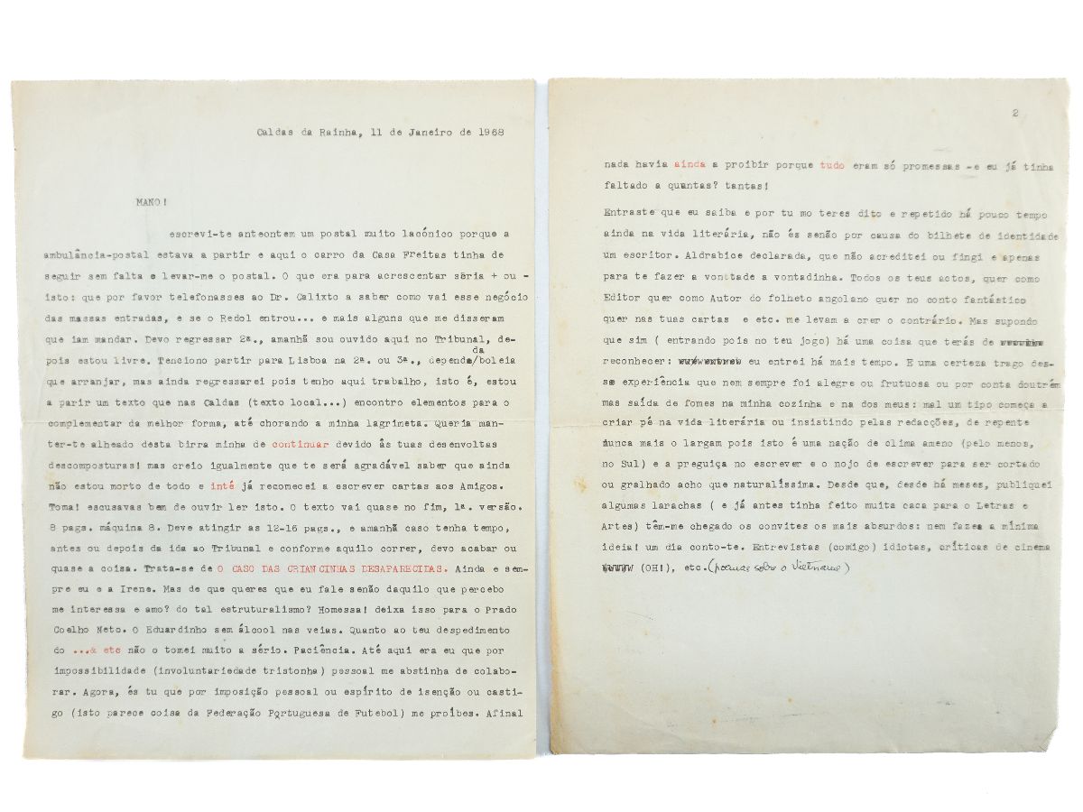 Carta manuscrita de Luiz Pacheco, dirigida ao “Mano”, 1968, sobre questões literárias e controversas. 2 folhas, na qual anuncia a obra “O Caso das Criancinhas Desaparecidas!.